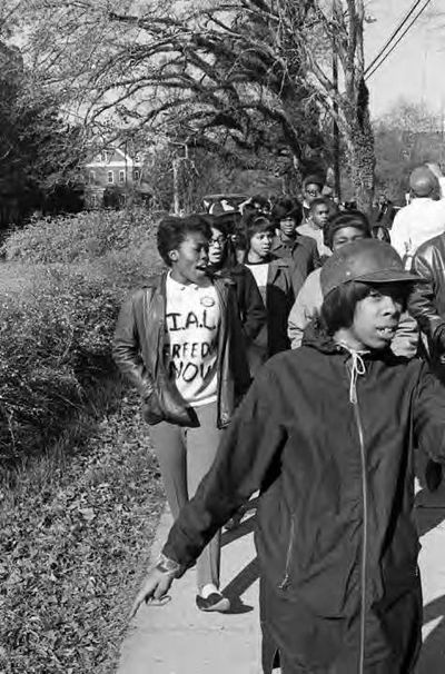 Image (right): Gwen Patton and other students from Tuskegee Institute marching down a sidewalk during a demonstration to protest the murder of Samuel L. Younge, Jr., a civil rights worker, 1966. (Alabama Department of Archives and History).